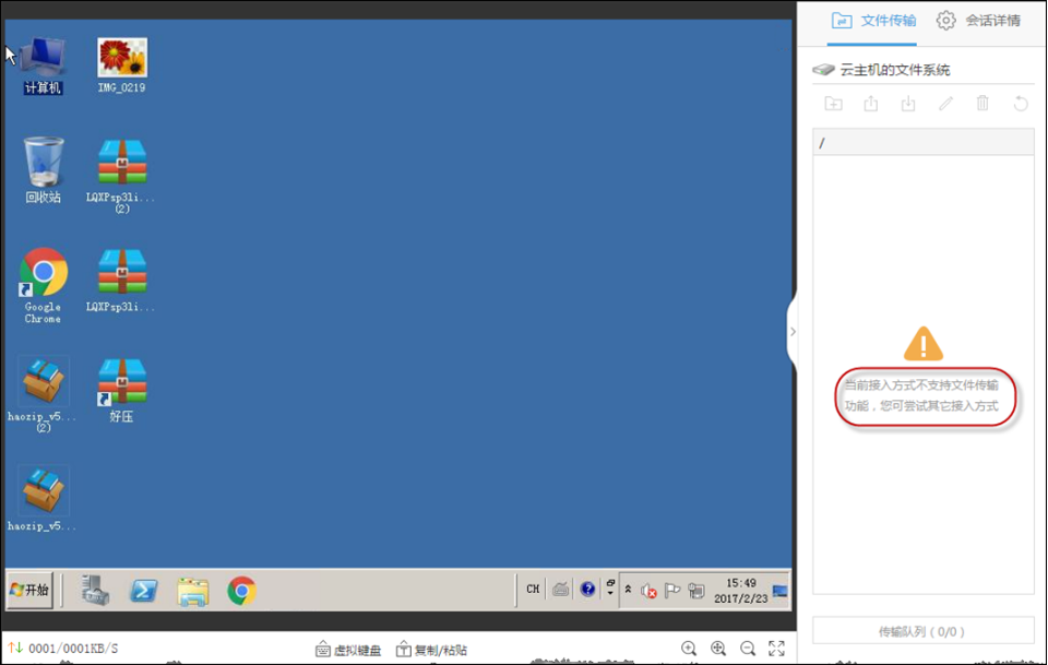 (2)进入会话后,在RDP会话右侧面板“文件传输”里可以进行文件上传、下载等操作。