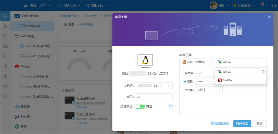 通过本地工具FTP协议方式来连接会话,可以进行文件传输,支持WinSCP、FileZilla等工具;