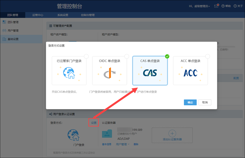点击“团队管理”菜单下的“基础设置”,在“用户登录认证设置”里的“登录方式”这里可以选择“CAS单点登录”;
