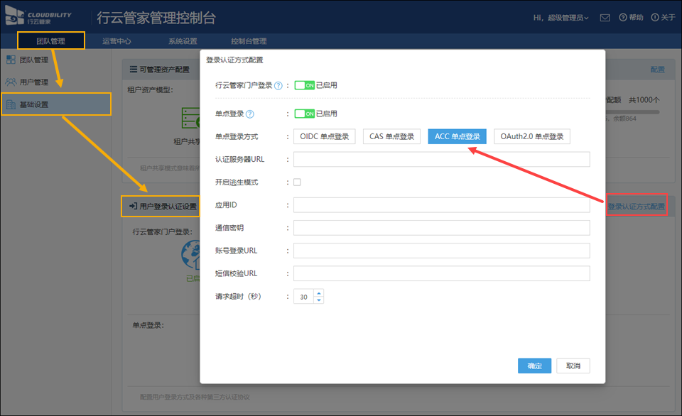 找到“团队管理”->“基础设置”->“用户登录认证设置”,点击“登录认证方式配置”,启用“单点登录”并选择“ACC单点登录”;