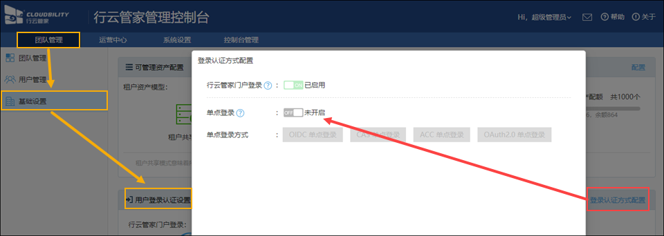 找到“团队管理”->“基础设置”->“用户登录认证设置”,点击“登录认证方式配置”,启用“单点登录”并选择“CAS单点登录”;